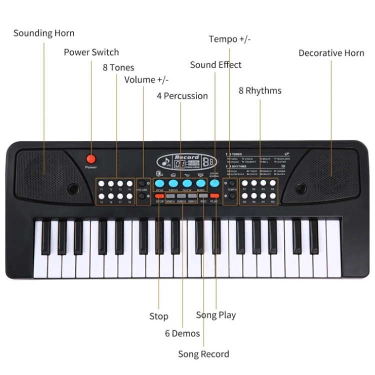 Equipped with dual speakers, 16 tones, 8 rhythms, 4 percussion sounds, 6 demo songs, and song recording/playback functions, it offers endless creativity. Additional controls include 8 volume levels, tempo adjustment, sound effects like sounding horn, and decorative modes for fun experimentation