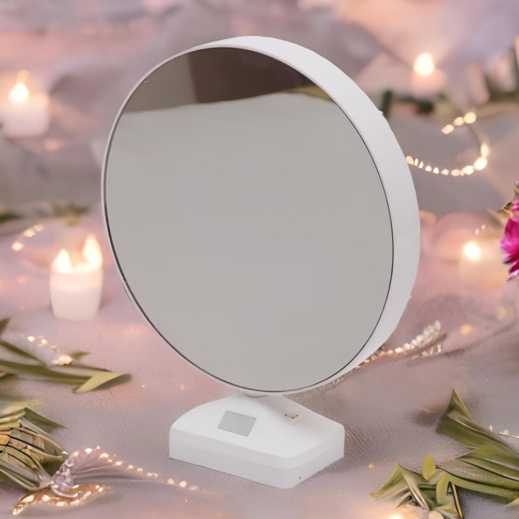 ��Round shape with approx. 20 cm (8 inch) mirror/photo area and about 25 cm total height, ideal for placing on tables, dressers and office desks.