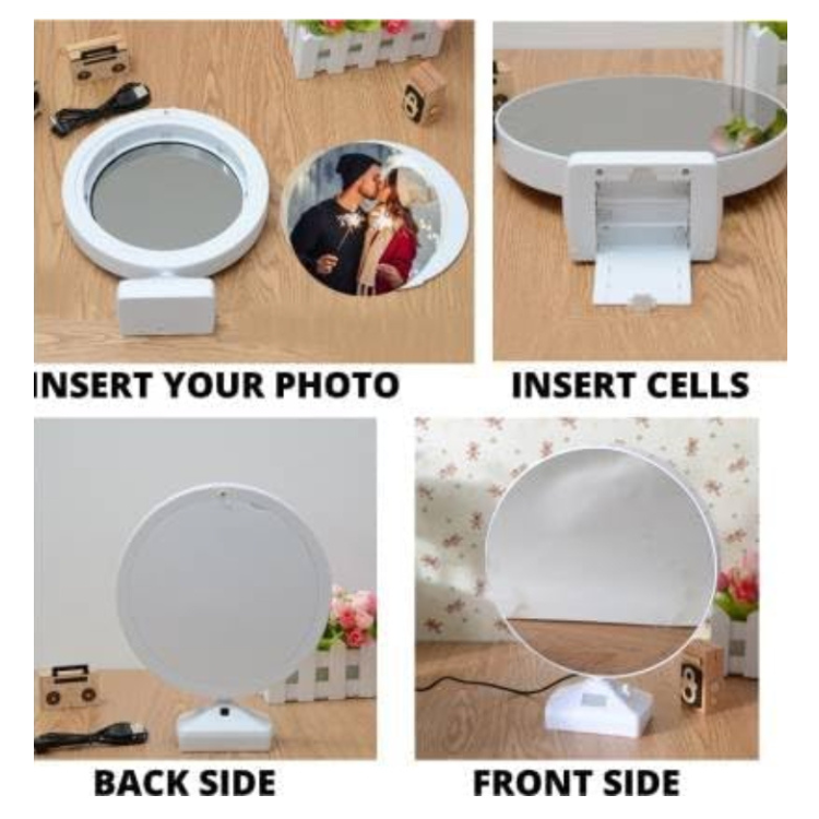 This Magic Mirror LED Photo Frame works as a clear round mirror when switched off and transforms into a glowing photo frame night lamp when the LED light is turned on, making it a beautiful personalised gift for any occasion.