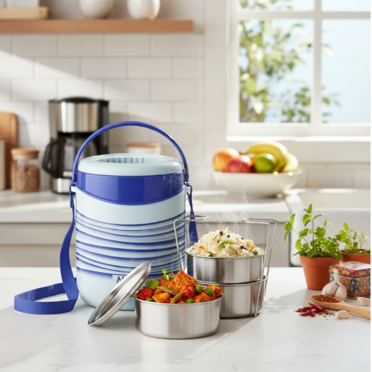 – Stylish and practical tiffin box for carrying home-cooked meals to the office