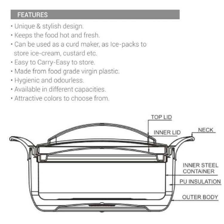 Made from food grade virgin plastic and from durable quality steel, the functional and leak proof lid of the casseroles with an easy grip which can be opened or shut with a simple motion and trap the heat effectively inside the casserole or hot pot., Hygienic and odourless