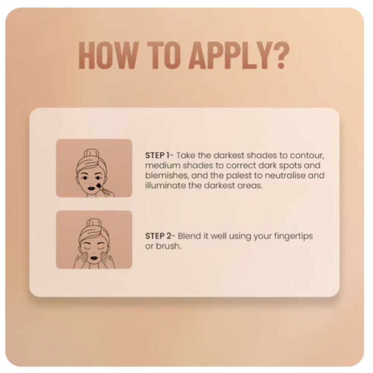 Highlight & Contour: Use lighter shades to brighten the under-eye area and high points of your face (cheekbones, nose bridge). Use the darkest shade to contour and define your facial features.